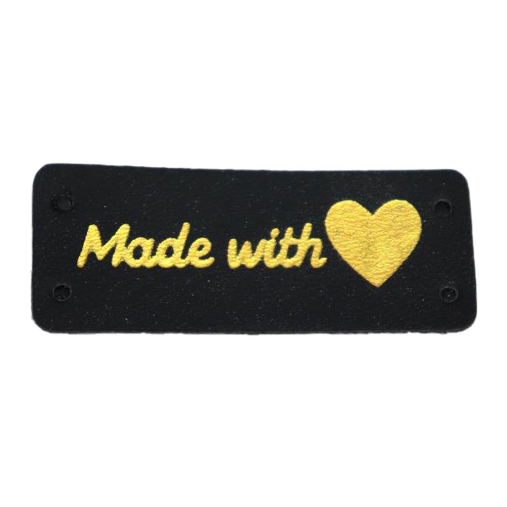 Koženková cedulka s hnědým nápisem Made with ♥ je vhodná jako štítek na vlastnoručně vyráběné produkty.