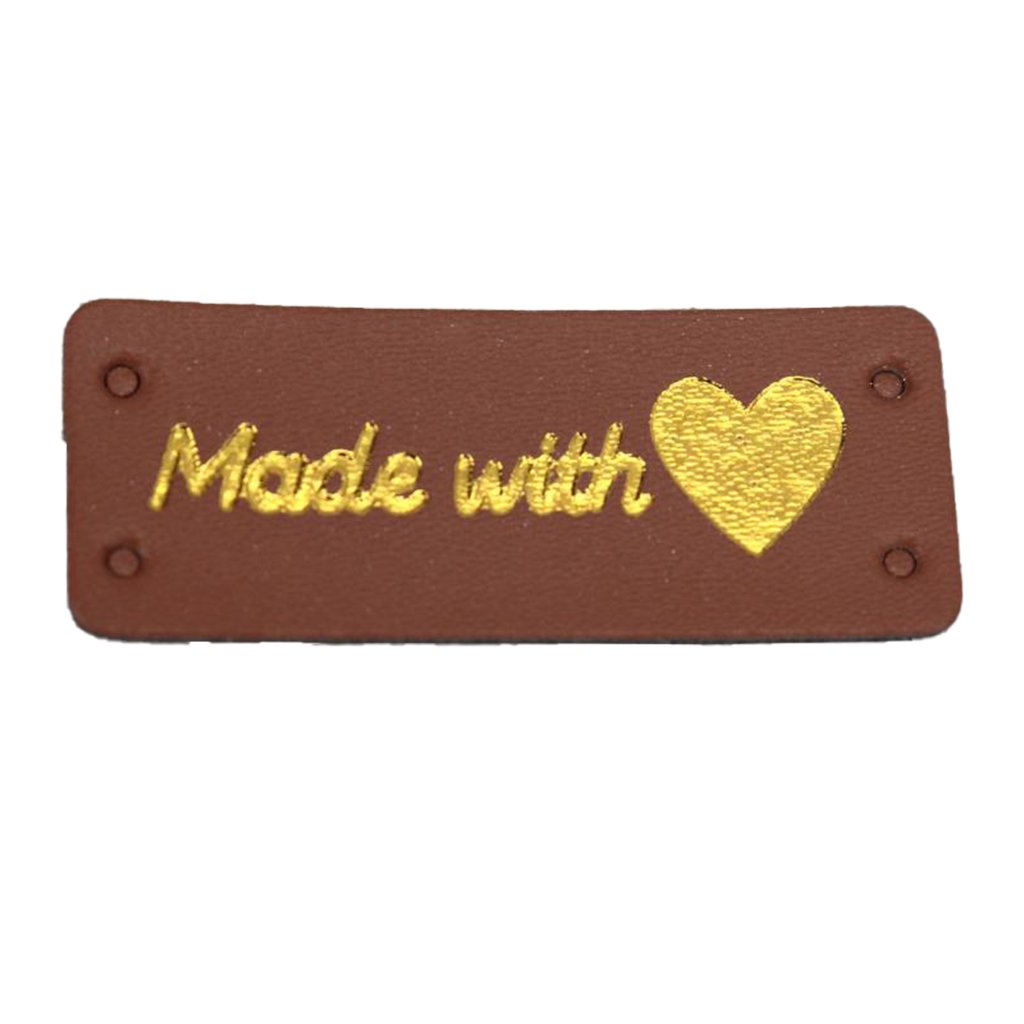 Koženková cedulka s hnědým nápisem Made with ♥ je vhodná jako štítek na vlastnoručně vyráběné produkty.