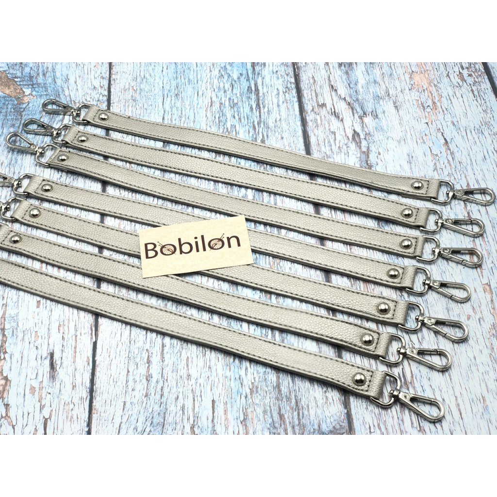Světlá stříbrno-šedá koženková ucha (nebo krátké popruhy) na kabelku od Bobilonu v délce 34 cm jsou vhodná na menší i větší kabelky přes ruku, na tašky nebo psaníčka.