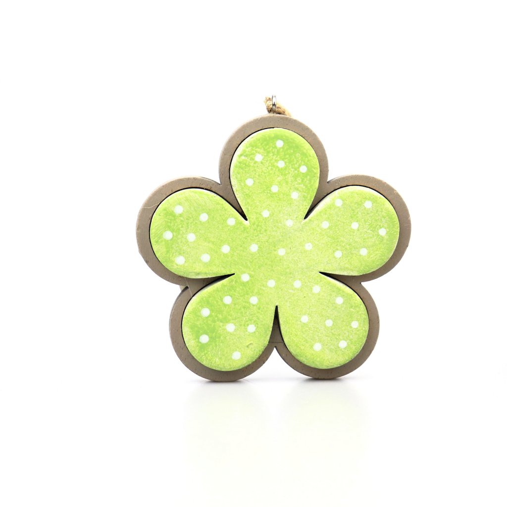 Dekorační kytka dřevěná ve vintage stylu, slepená ze dvou částí. Spodní část je šedá, vrchní část je zelená s bílými puntíky.