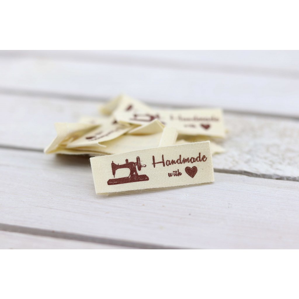 Látková cedulka Handmade s šicím strojem, barva bílá natural, podélná.