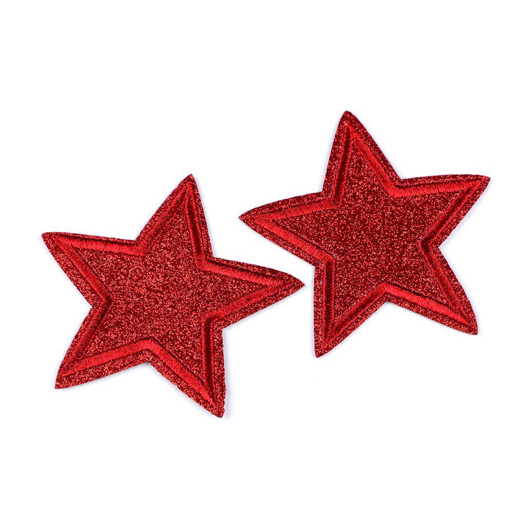 Nažehlovačka ve tvaru hvězdy je lemována lurexovou výšivkou a ozdobena glitry. Třpytivá hvězda červená.
