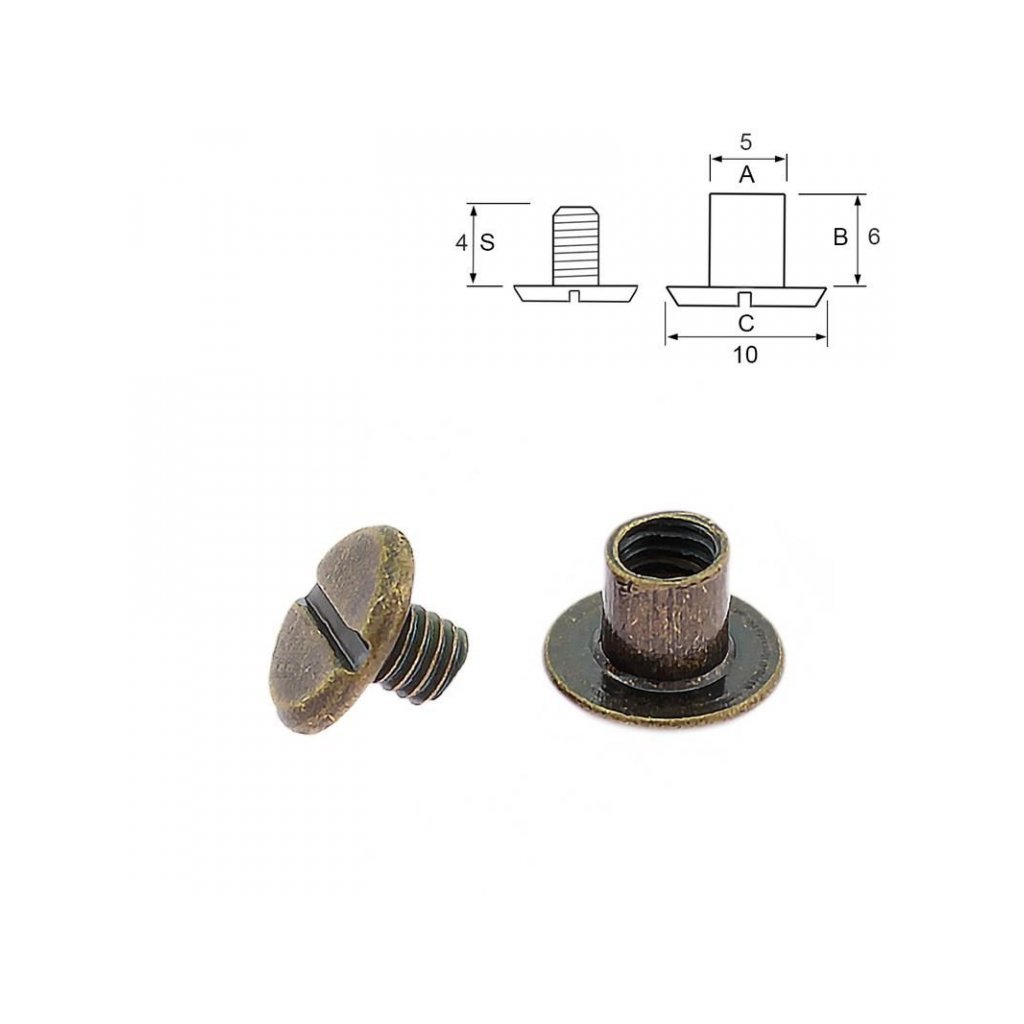 Kovový opaskový šroub s povrchovou úpravou staromosaz se skládá ze dvou částí. Dutý šroub s vnitřním závitem a plnou hlavičkou, který slouží jako uzavřená matice. Protikus šroub pro dotažení spoje. Výhodou šroubovacího spoje je rychlá a snadná manipulace například při výměně opaskové přezky nebo ke spojení dvou materiálů.