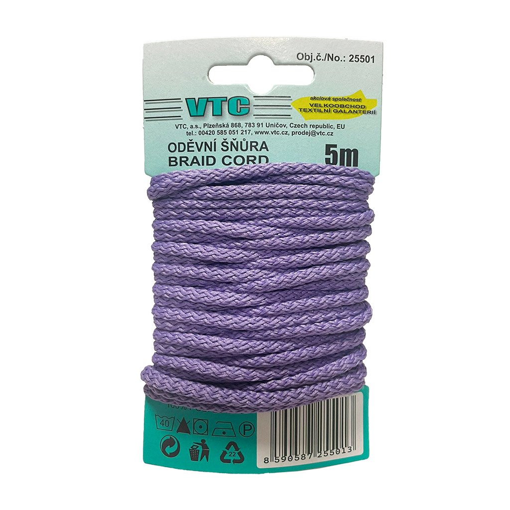 Oděvní šňůra 5 m na kartě - 21 levandulová