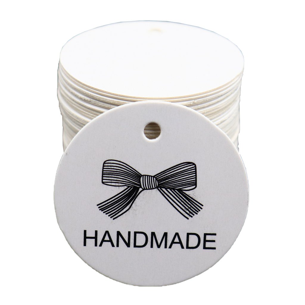 Papírová cedulka kulatá s nápisem Hand Made a mašličkou.