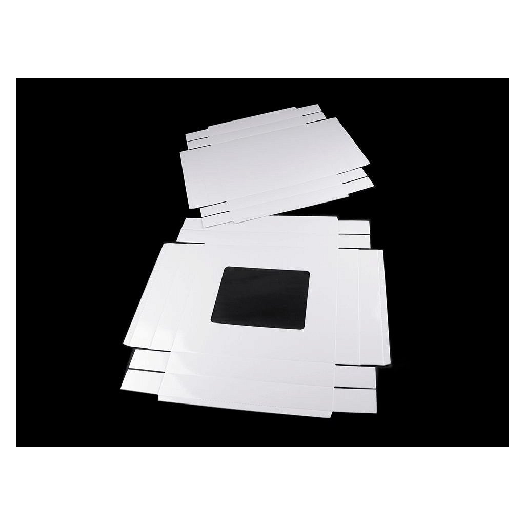 Papírová krabice s průhledem. Barva: lesklá bílá. Rozměry: 24,5 x 27,5 cm. Výška: 4 cm. Rozměr průhledu: 13 x 17 cm. Materiál: papír a plast.