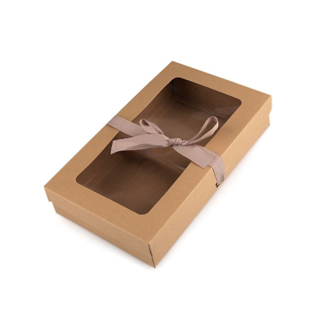 Papírová krabička s průhledem a stuhou 6 x 16 x 27 cm hnědá. Barva: hnědá. Velikost: 16 x 27 cm. Výška: 6 cm. Rozměr průhledu: 11,5 x 22,5 cm. Materiál: papír a plast.