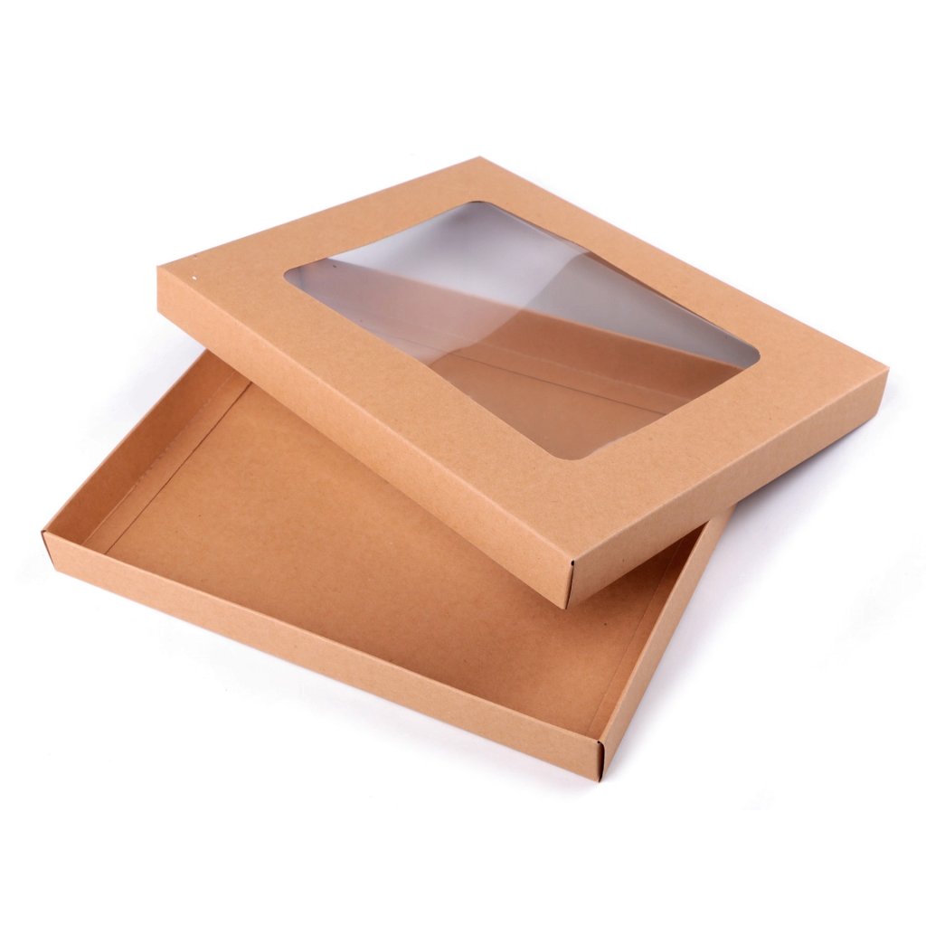 Papírová krabice s průhledem. Barva: hnědá. Rozměry: 22 x 27 cm. Výška: 2,5 cm. Rozměr průhledu: 14 x 19 cm. Materiál: papír a plast.