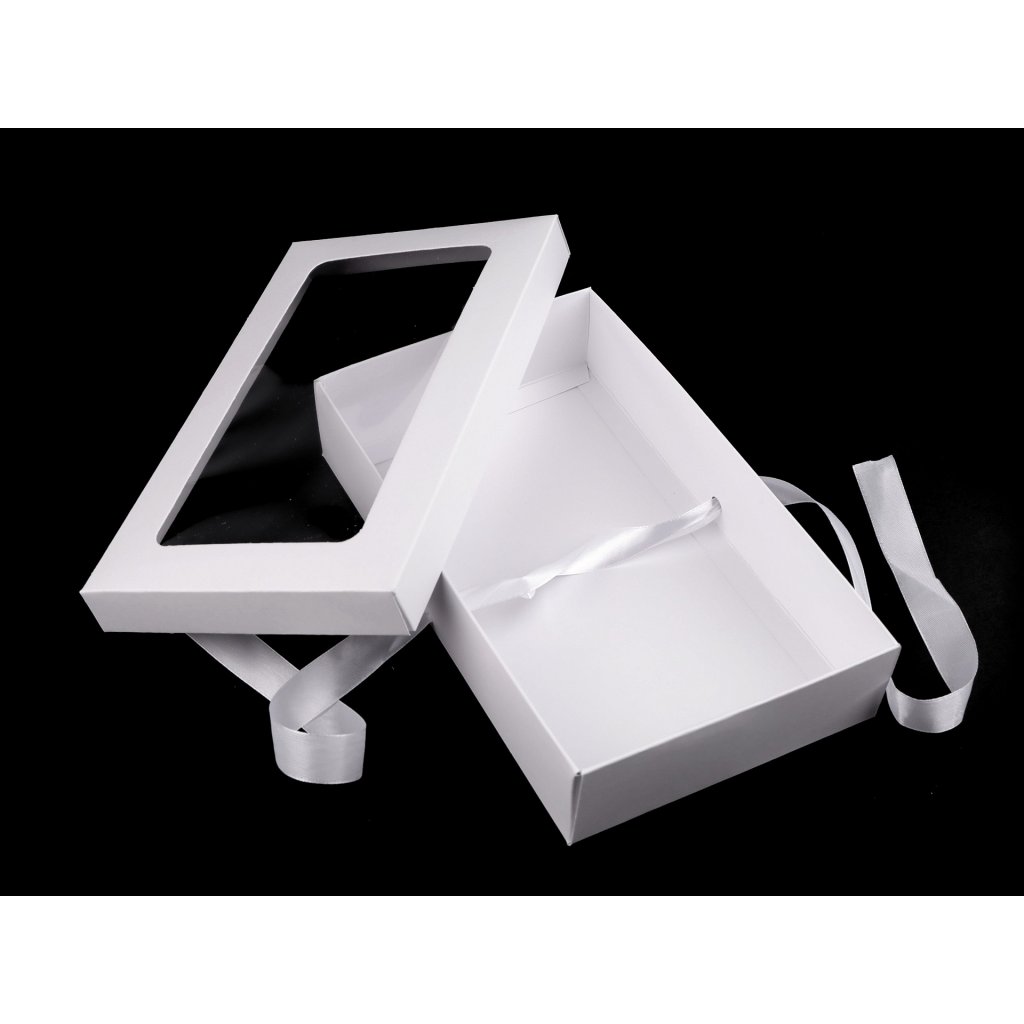 Papírová krabička s průhledem a stuhou 25,5 x 15,5 x 5 cm bílá
