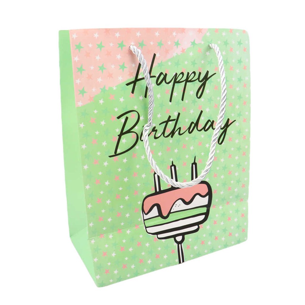 Papírová dárková taška k narozeninám ve stylovém zlatočerném designu s motivem dárkových krabiček a nápisem Happy Birthday.