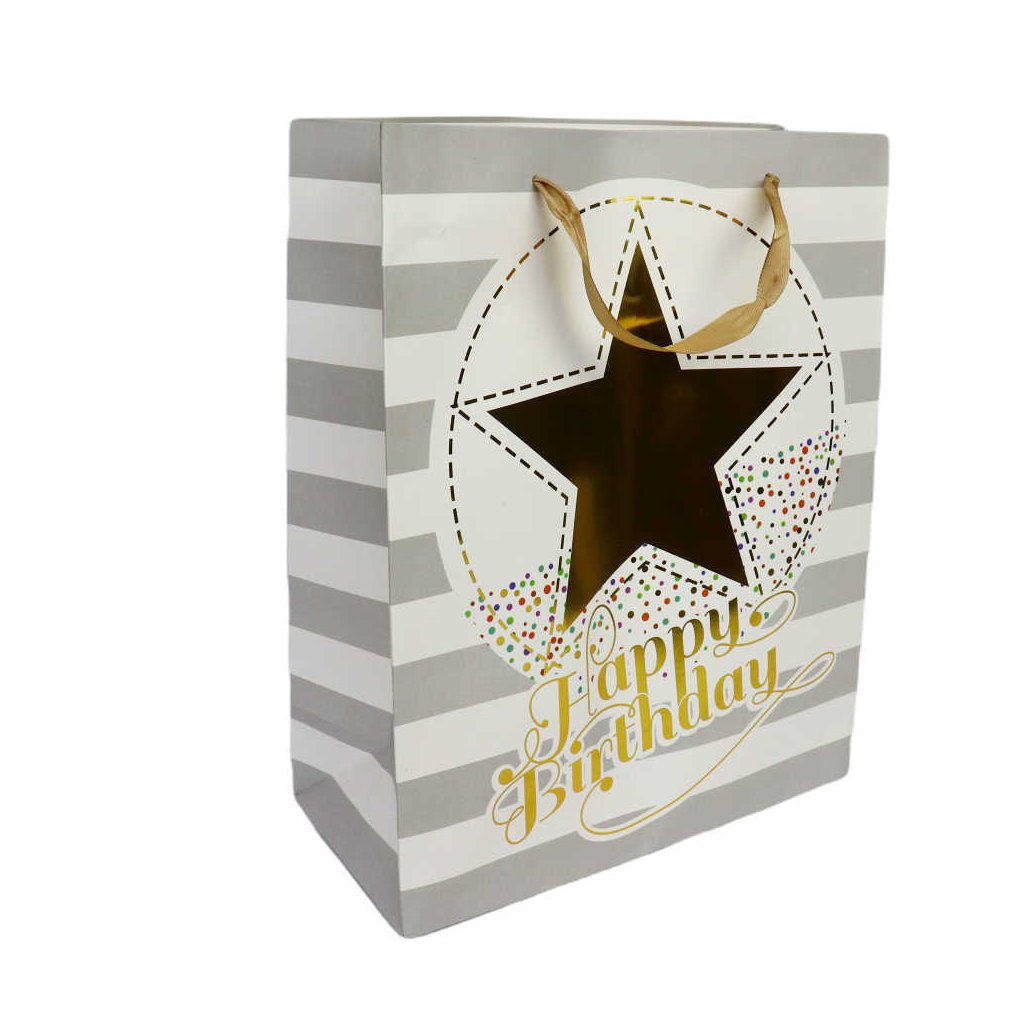 Papírová dárková taška k narozeninám s nápisem Happy Birthday a hvězdou ve zlaté barvě je ideální na středně velké dárky.
