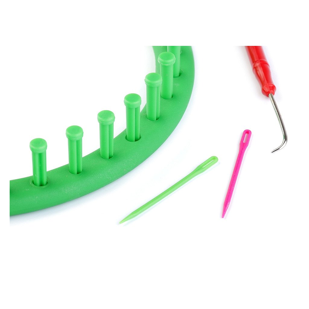 Balení obsahuje kovový háček pro snadné snímání ok a 2 plastové jehly k zapošití příze. Součástí balení je i podrobný návod v češtině, slovenštině a angličtině. Na kruhu je 36 hrotů + 1 pomocný hrot je z boku.