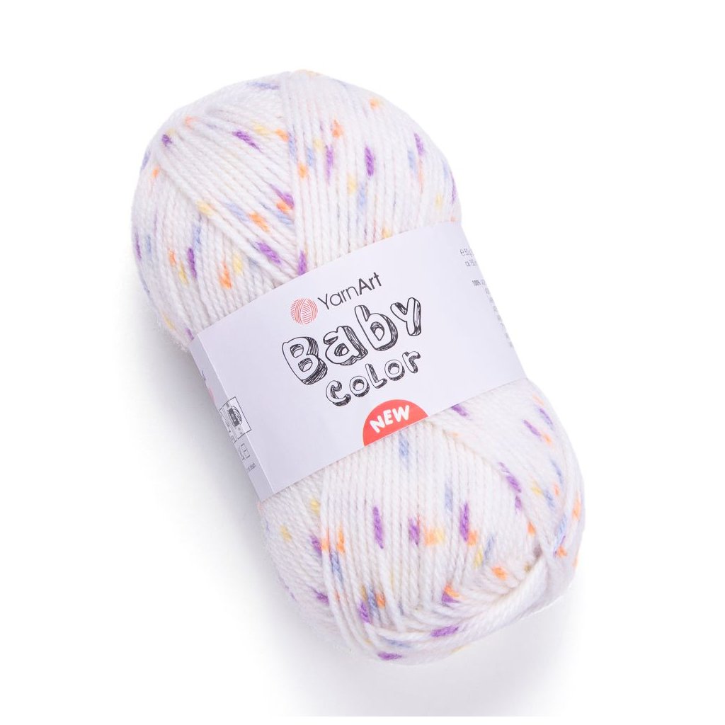 příze Baby Color 217 smetanová s fialovou, modrou a oranžovou.