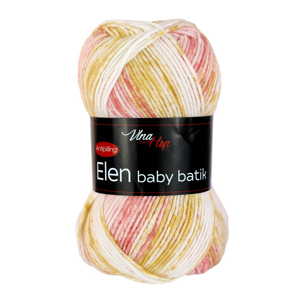 Stejně jako její jednobarevná sestra je i Elen baby batik velmi univerzální akrylová příze, kterou využijete na čepice, nákrčníky, rukavice, svetry, vesty, ponča, šaty, sukně.