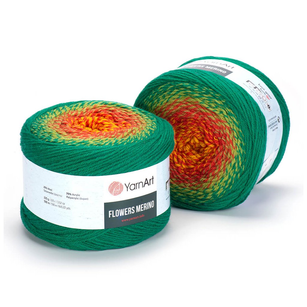 Flowers Merino je středně silná duhová akrylová příze s 25 % příměsí merino vlny. Praktickou stránku akrylu skvěle doplňuje hřejivost merina.