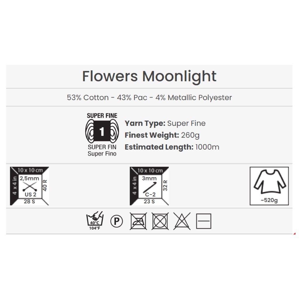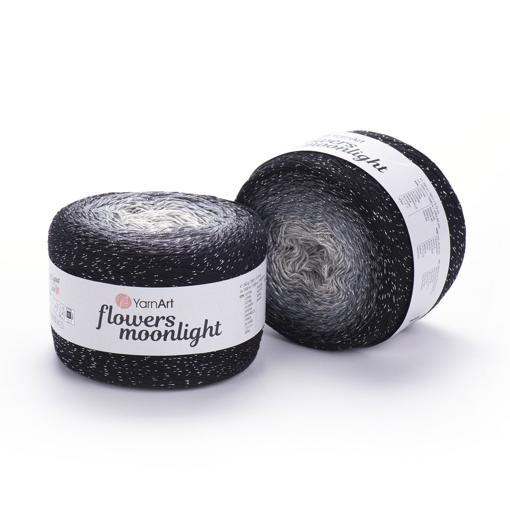 Flowers Moonlight je směsová příze s postupnými přechody. Využijete ji především na šátky a plédy, ale také na lehké svetříky, šaty, sukně, vesty a další doplňky.