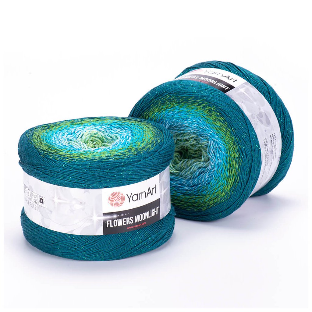 Flowers Moonlight je směsová příze s postupnými přechody. Využijete ji především na šátky a plédy, ale také na lehké svetříky, šaty, sukně, vesty a další doplňky.