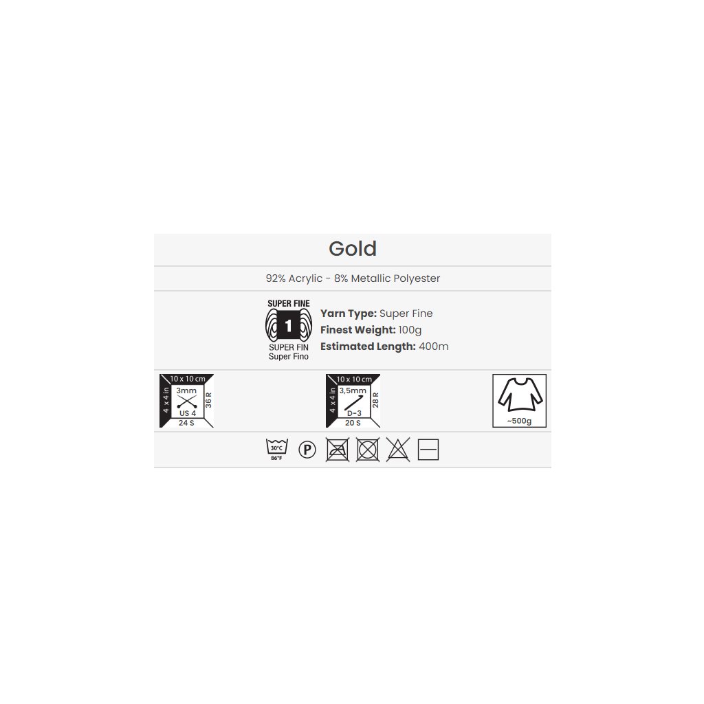 Příze gold je efektní tenčí příze s lurexovým vláknem (stříbrným, zlatým, barevným), ze které vyrobíte krásné úplety, např. svetry, vesty, plédy, ale také čepice, šálky, tunely, popř. je tato příze využívána k oživení jednobarevných úpletů na lemy, kapsy, kytičky apod. Prozáří i pohovky, pokud si z ní vyrobíte třeba povlaky na polštářky.