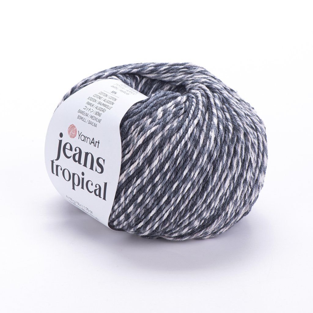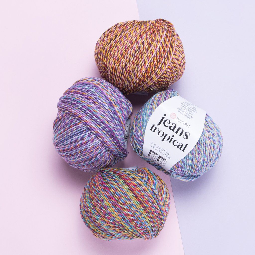 Jeans Tropical (dříve Gina Tropical) je žíhaná varianta příze Jeans, ideální na čepičky, šátky, sukýnky a topy, ale i na pestré bytové doplňky.