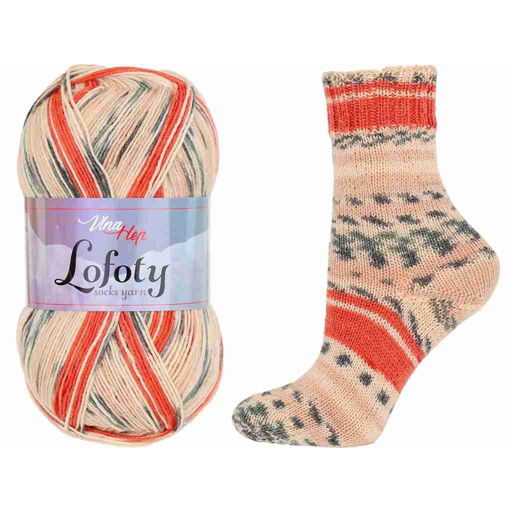 Jedná se o přízi s vysokým podílem superwash vlny, která je upravena tak, že ji lze prát v pračce. Lofoty je samovzorovací příze s efektem norských vzorů, výsledek se liší v závislosti na počtu ok v jednotlivých řadách, tedy jiný vzor se vytvoří např. na ponču a jiný na ponožkách. Z jednoho klubíčka upletete jeden pár klasických ponožek.