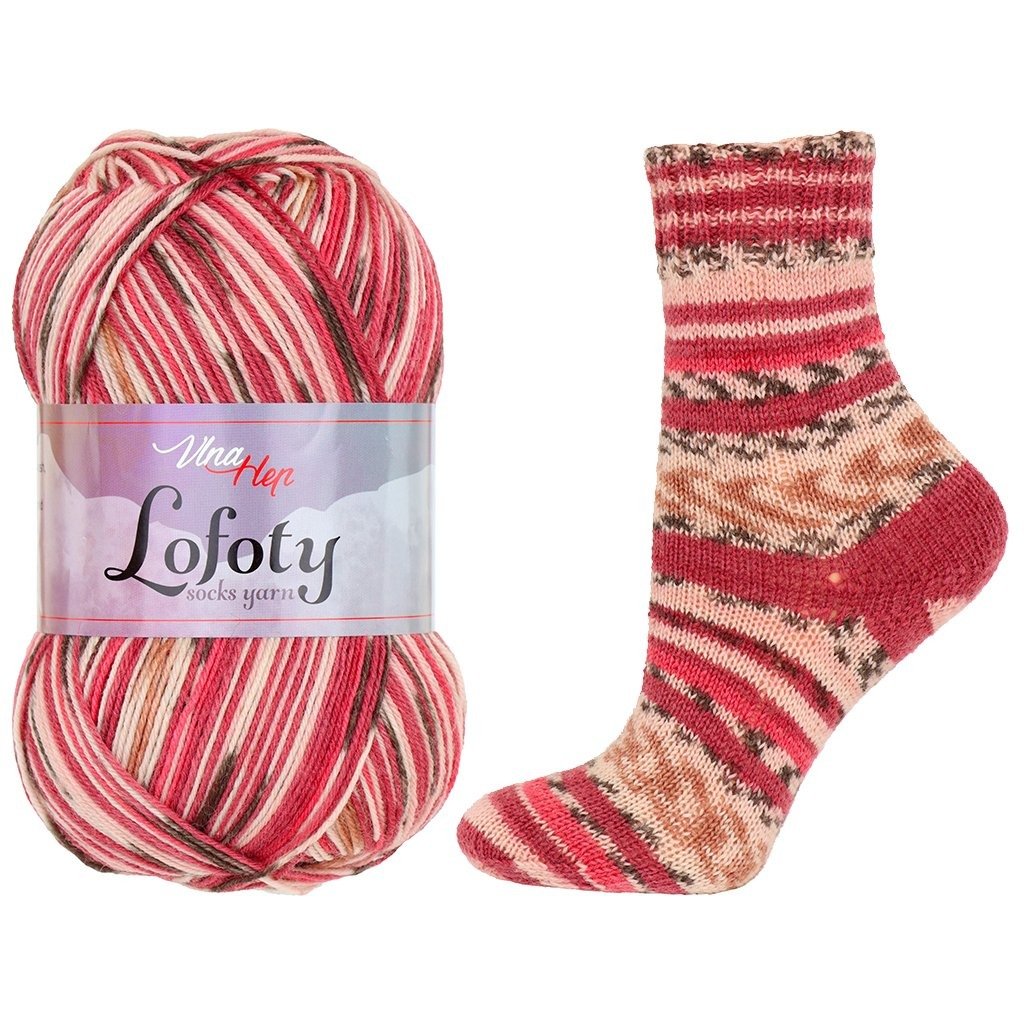 Jedná se o přízi s vysokým podílem superwash vlny, která je upravena tak, že ji lze prát v pračce. Lofoty je samovzorovací příze s efektem norských vzorů, výsledek se liší v závislosti na počtu ok v jednotlivých řadách, tedy jiný vzor se vytvoří např. na ponču a jiný na ponožkách. Z jednoho klubíčka upletete jeden pár klasických ponožek.