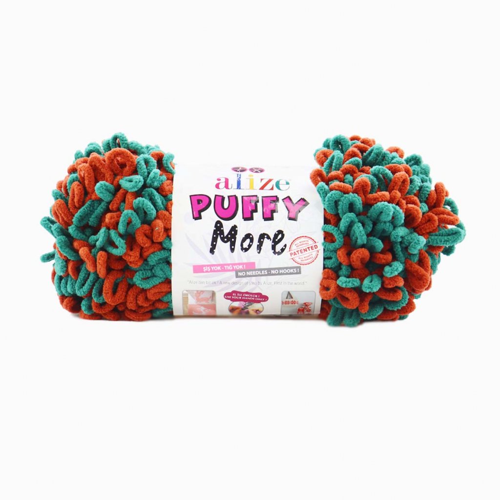 příze Puffy More 6294 zelená a cihlově hnědá.
