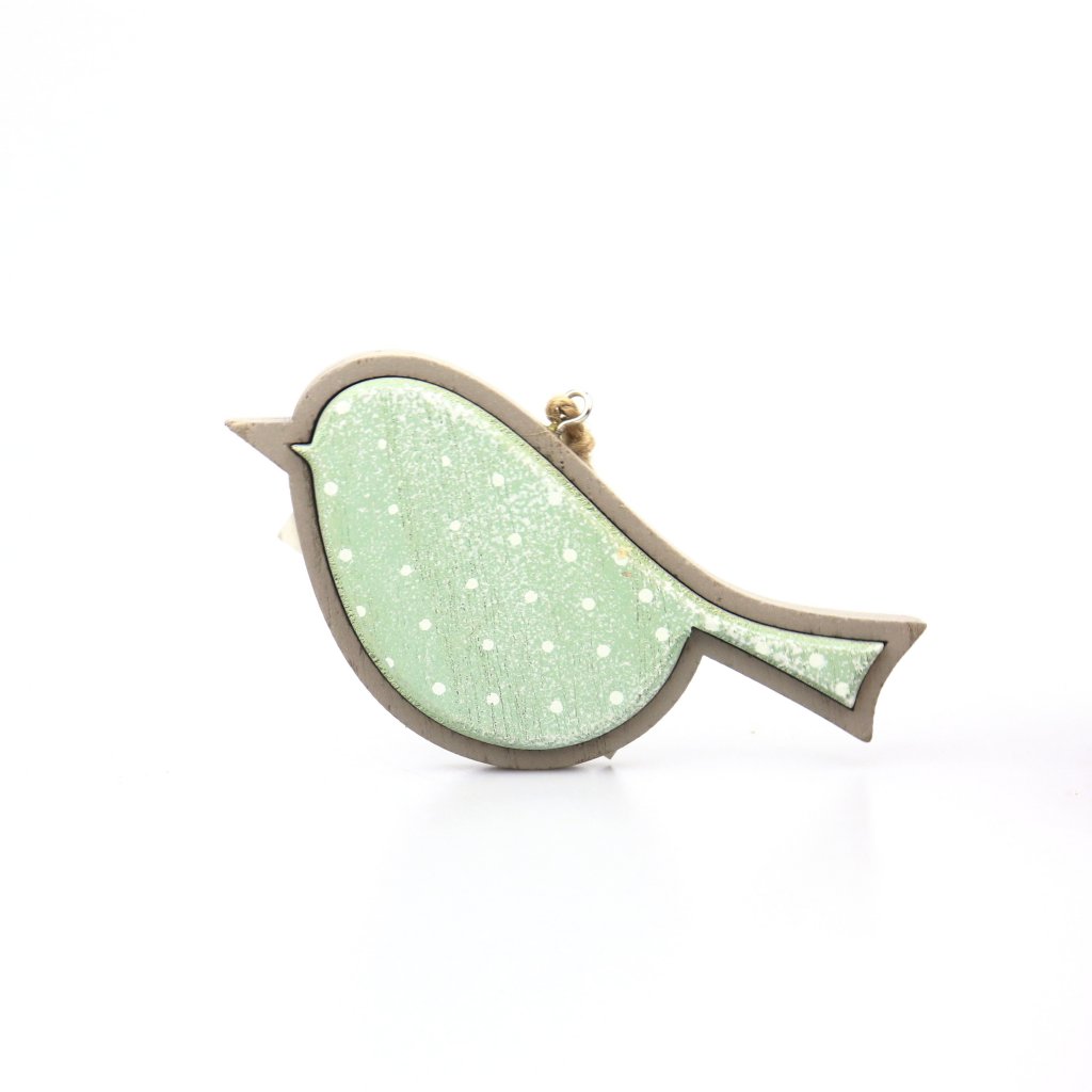 Dekorační ptáček dřevěný ve vintage stylu, slepený ze dvou částí. Spodní část je šedá, vrchní část je zelenošedá s bílými puntíky.