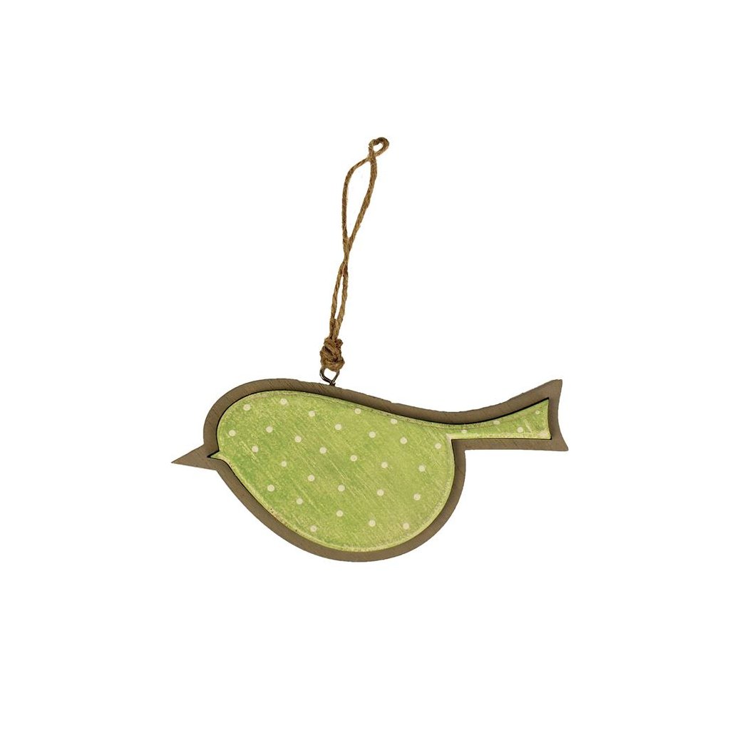 Dekorační ptáček dřevěný ve vintage stylu, slepený ze dvou částí. Spodní část je šedá, vrchní část je zelená s bílými puntíky.
