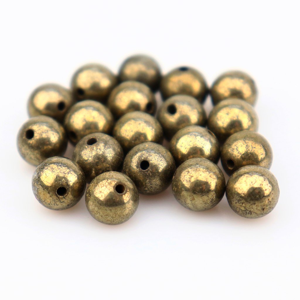Pyritové korálky mají kovově lesklý povrch a zlato zelenou barvu.