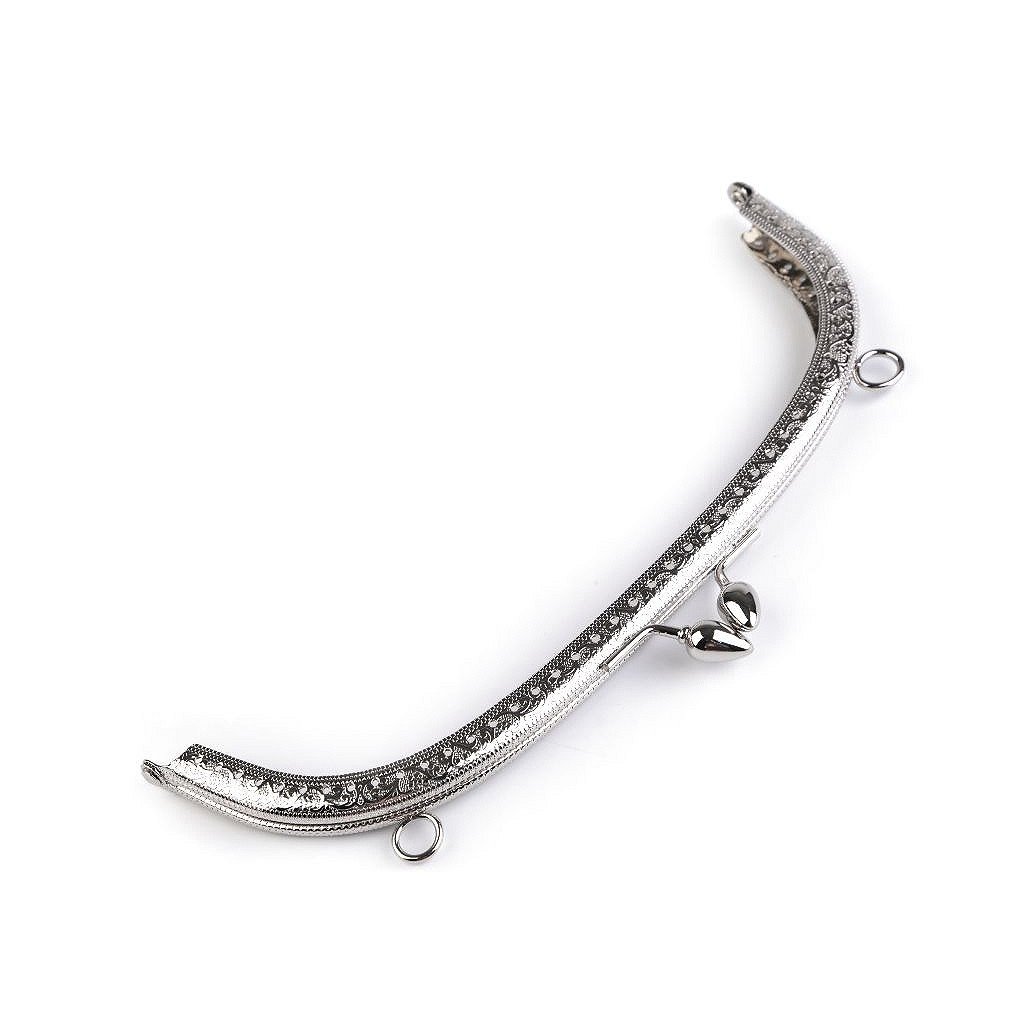 Kovový rámeček se zapínáním je určený na výrobu kabelky či psaníčka. Zapínání má nahoře úchyty na ucha a popruhy. Rámeček se na kabelku našívá, látka se vloží dovnitř a ručně přešije přes dírky, jejichž rozpětí je 6 mm. Dírky jsou jen na vnější straně rámečku, která je delší než vnitřní, tudíž je našívání jednodušší.