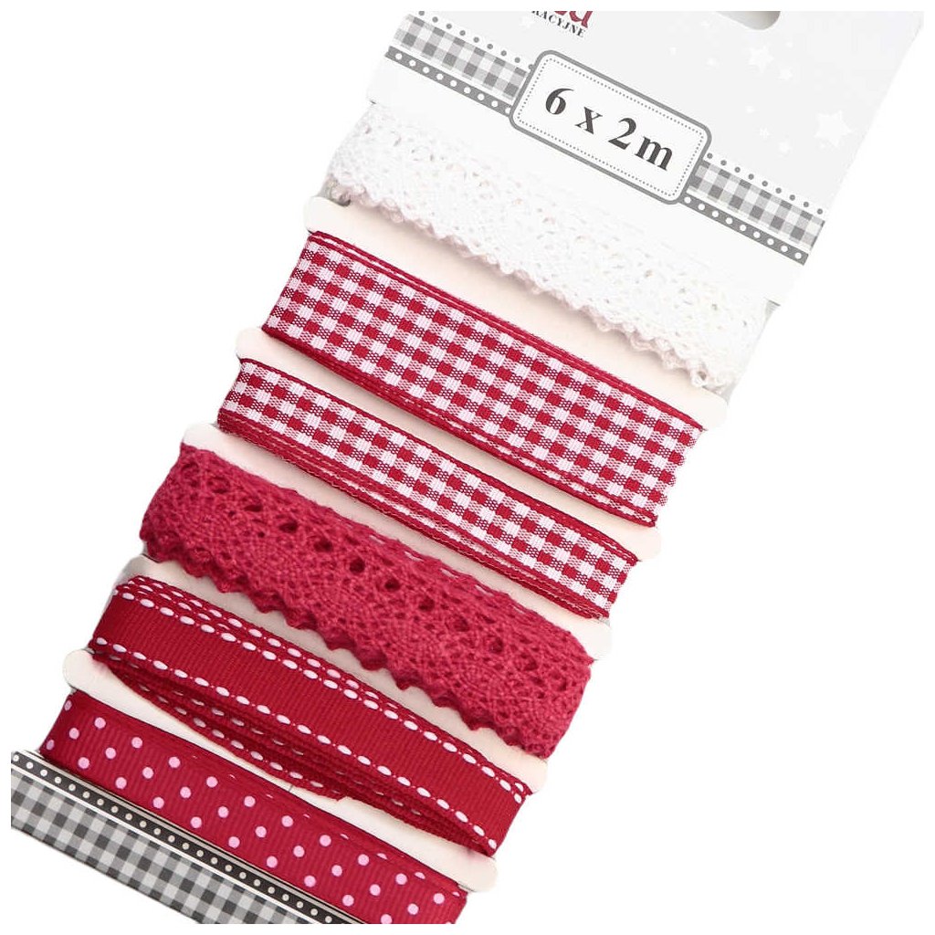 Sada obsahuje: 2x károvaná stuha, 1x stuha s malými puntíky, 1x prošívaná stuha, 2x krajková stuha.