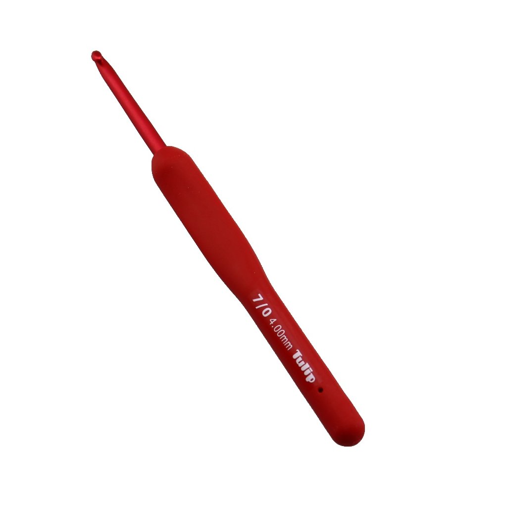 Háčky Tulip Etimo Red "soft grip" mají měkkou silikonovou rukojeť a hladký háček, matné červené tóny neodrážejí světlo a jsou šetrné na oči, zajišťují tak dlouhé hodiny příjemného háčkování.