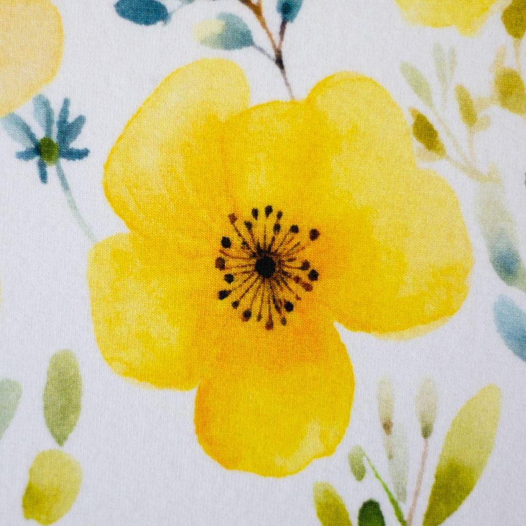 Úplet Summer od společnosti Swafing je kvalitní bavlněný žerzej s osvěžujícím vzorem žlutých akvarelových květin na bílém podkladu. Tento design přináší do vašich projektů letní atmosféru a svěžest.