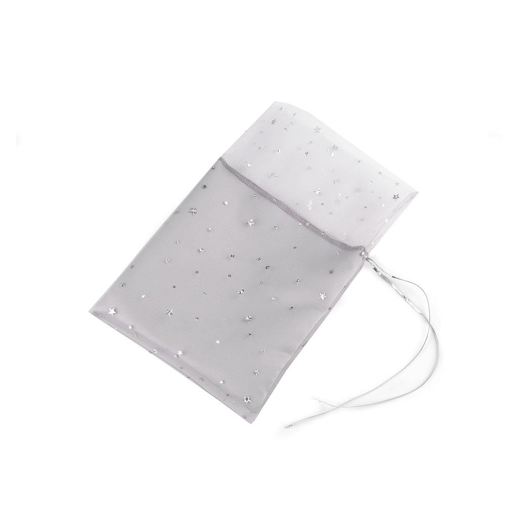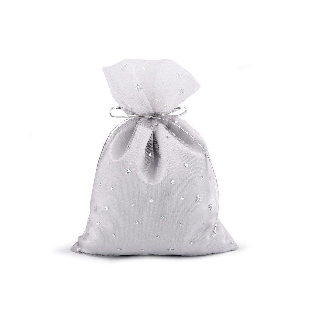 Vánoční dárkový pytlík tylový 19x27 cm s hvězdami, bílý se stříbrnými hvězdičkami.