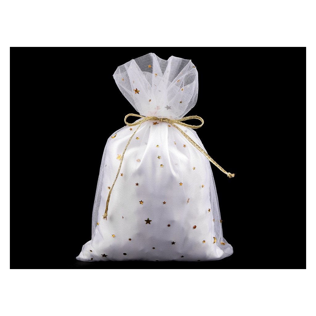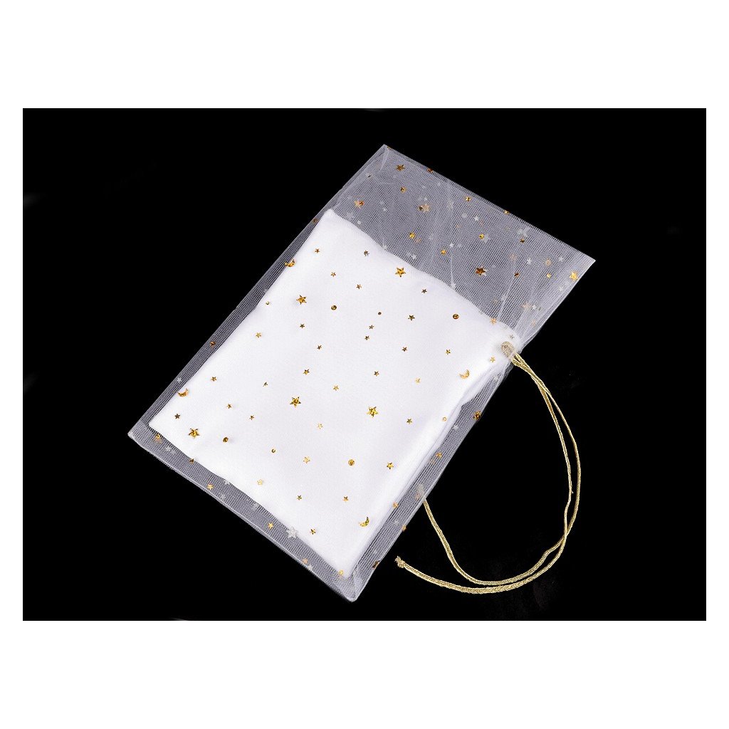 Vánoční dárkový pytlík tylový 19x27 cm s hvězdami, bílý se zlatými hvězdičkami.