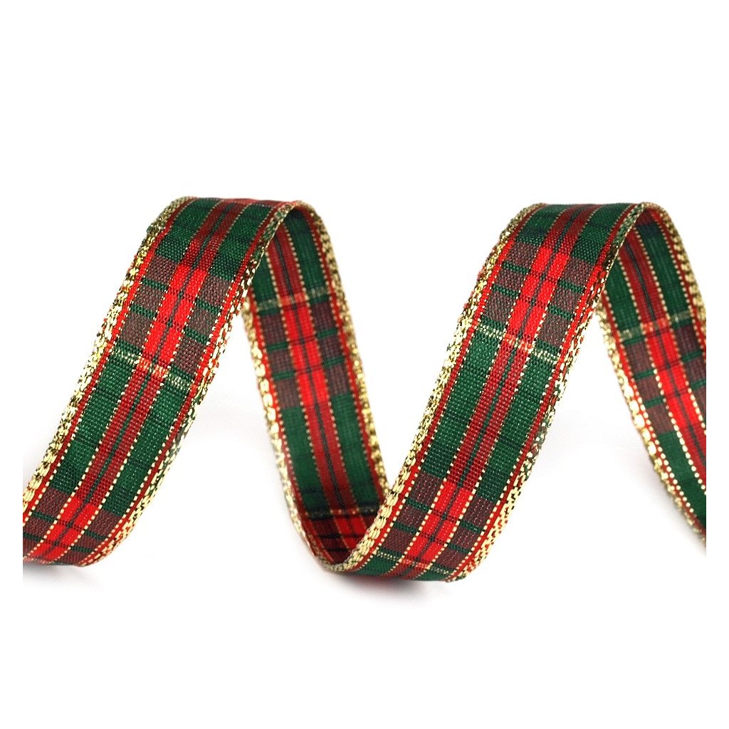 Károvaná stuha v zelené a červené barvě s obsahem lurexu je oboustranná a pevná.