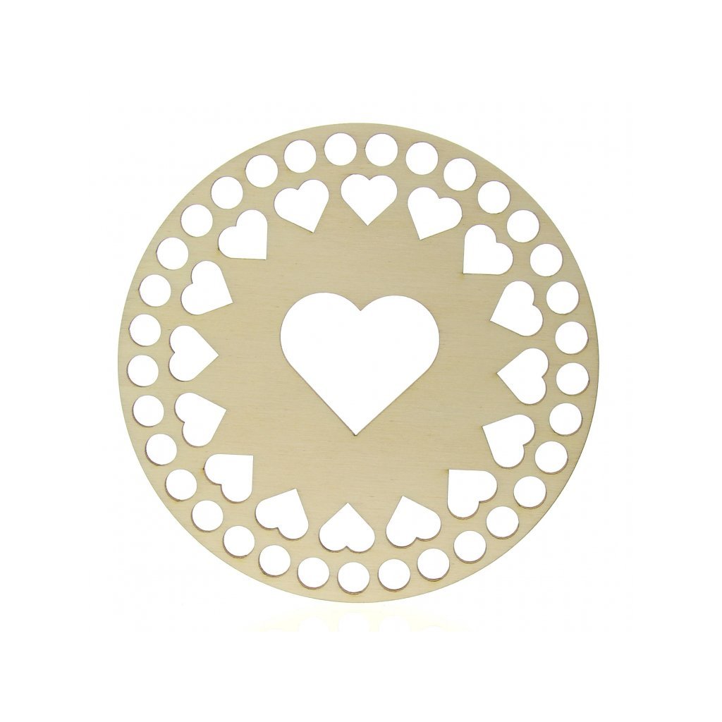 Víko na košík, kruh Ø 15 cm, zdobené vyřezávanými srdci.