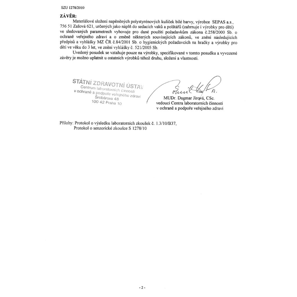 Materiálové složení napěněných polystyrénových kuliček bílé barvy, určených jako náplň do sedacích vaků a polštářů, (zahrnuje i výrobky pro děti) ve sledovaných parametrech vyhovuje pro dané použití požadavkům zákona č. 258/2000 Sb. o ochraně veřejného zdraví a o změně některých souvisejících zákonů, ve znění následujících předpisů a vyhlášky MZ ČR č. 84/2001 Sb. o hygienických požadavcích na hračky a výrobky pro děti ve věku do 3 let, ve znění vyhlášky č. 521/2005 Sb.