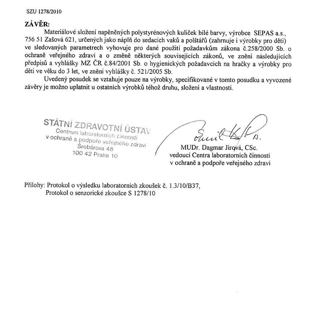 Materiálové složení napěněných polystyrénových kuliček bílé barvy, určených jako náplň do sedacích vaků a polštářů, (zahrnuje i výrobky pro děti) ve sledovaných parametrech vyhovuje pro dané použití požadavkům zákona č. 258/2000 Sb. o ochraně veřejného zdraví a o změně některých souvisejících zákonů, ve znění následujících předpisů a vyhlášky MZ ČR č. 84/2001 Sb. o hygienických požadavcích na hračky a výrobky pro děti ve věku do 3 let, ve znění vyhlášky č. 521/2005 Sb.