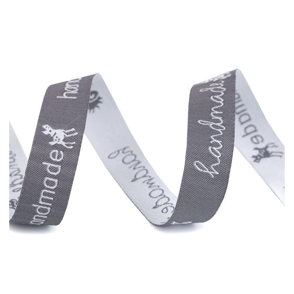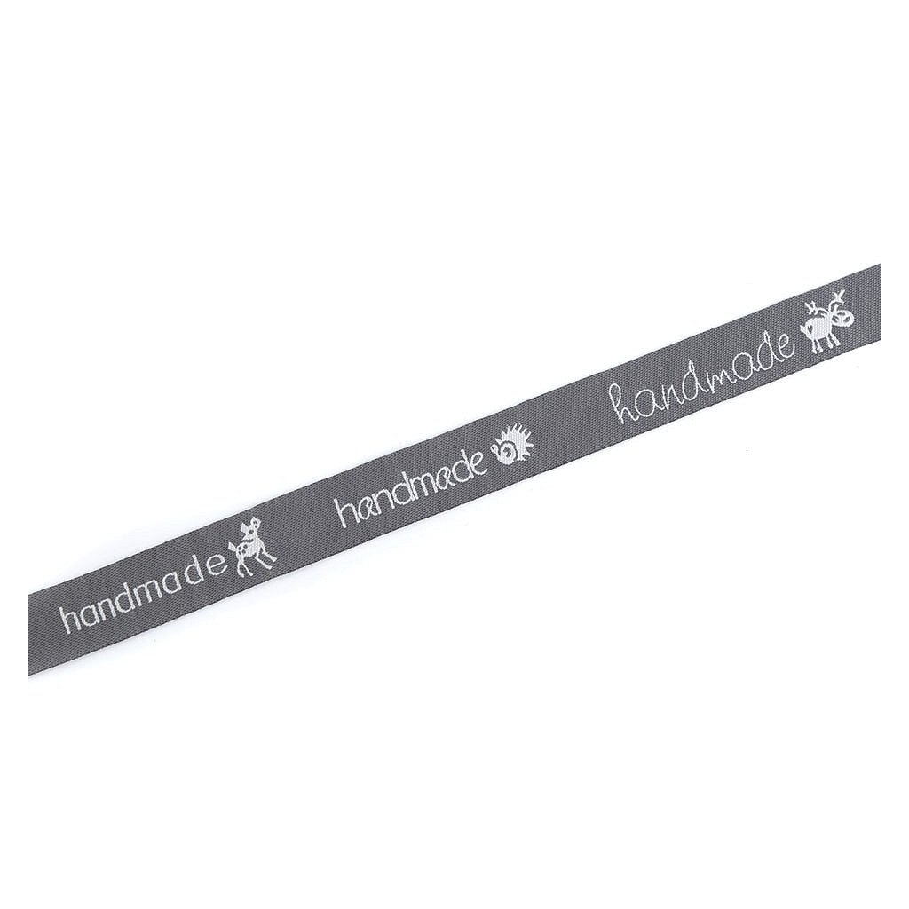 Vzorovka hand made bílošedá. Materiál: 100% polyester. Šíře: 16 mm. Cena za 1 m. Vzorovaná stuha s nápisem "handmade" je doplněna obrázky zvířátek (srnka, ježek, sob, žába), které se pravidelně střídají. Použití: Vzorovku využijete k našití jako štítky na ručně dělané výrobky, například tašky, šály a různé oděvy.Je vhodná také na scrapbooking nebo balení dárků.