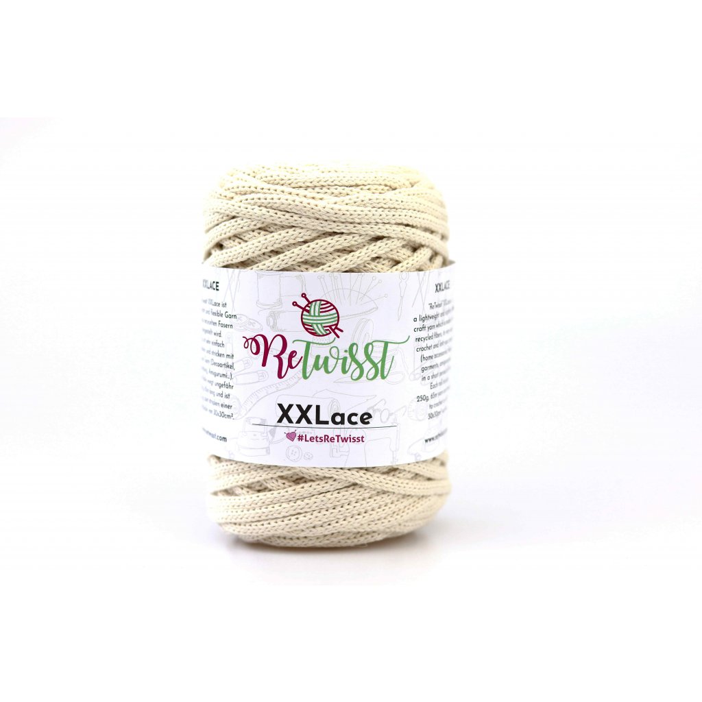 XXLace šňůry o průměru 4,5 cm jsou ideální háčkovací šňůry pro výrobu košíků, pufů - taburetů, koberců, různých tašek a kabelek.
