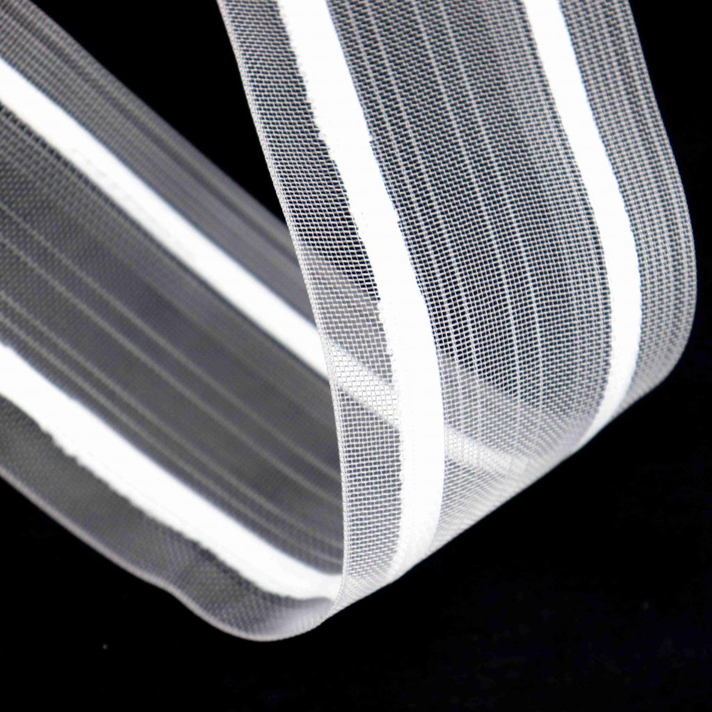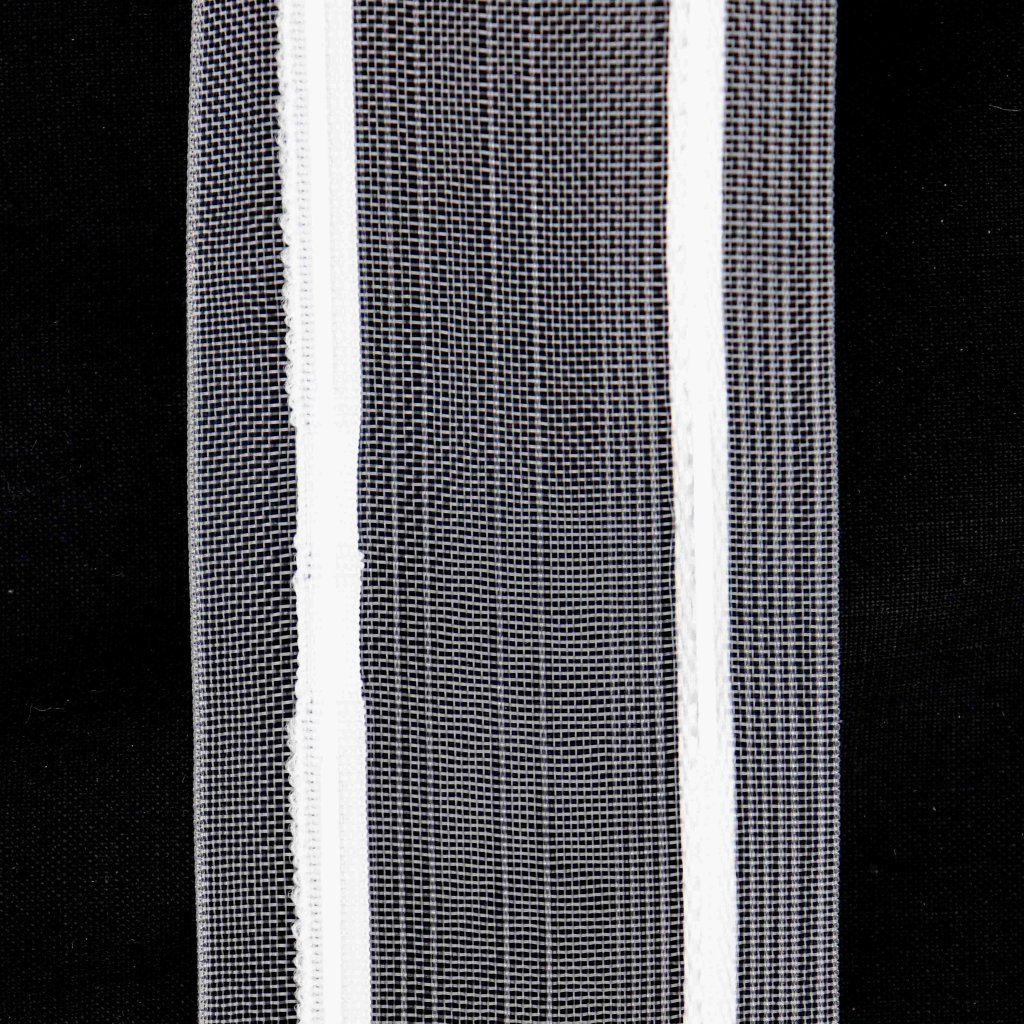 Záclonová stuha řasící je lehce transparentní v bílé barvě. Uvnitř jsou všité šňůrky, pomocí kterých stáhnete stuhu do pravidelných skladů v rozestupech 1 : 2,25. Ze zadní strany je stuha je opatřena očky pro upevnění háčků nebo žabek.